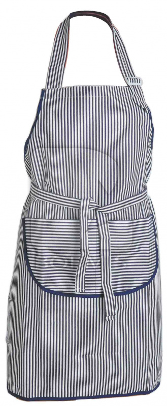 Modrobiela zástera s predným vreckom, rozdelená na dve časti. Nastaviteľná výška na plastovú sponu a viazaním na šnúrku.
