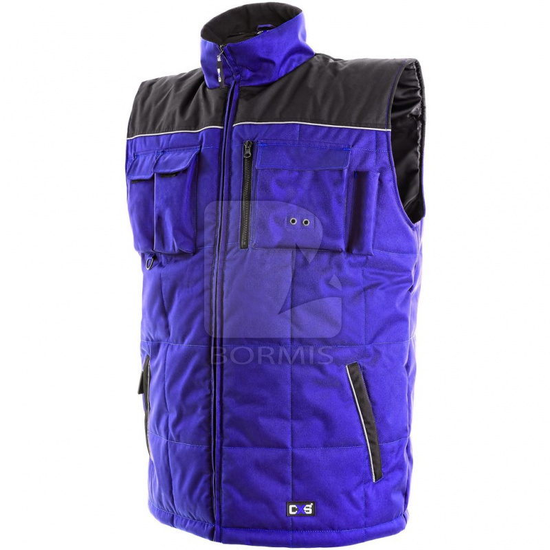 Zateplená vesta s fleecovým golierom, reflexné výpustky, sťahovanie v dolnom okraji, vnútorné vrecko, odolnosť materiálu voči prieniku vody 2000mm.