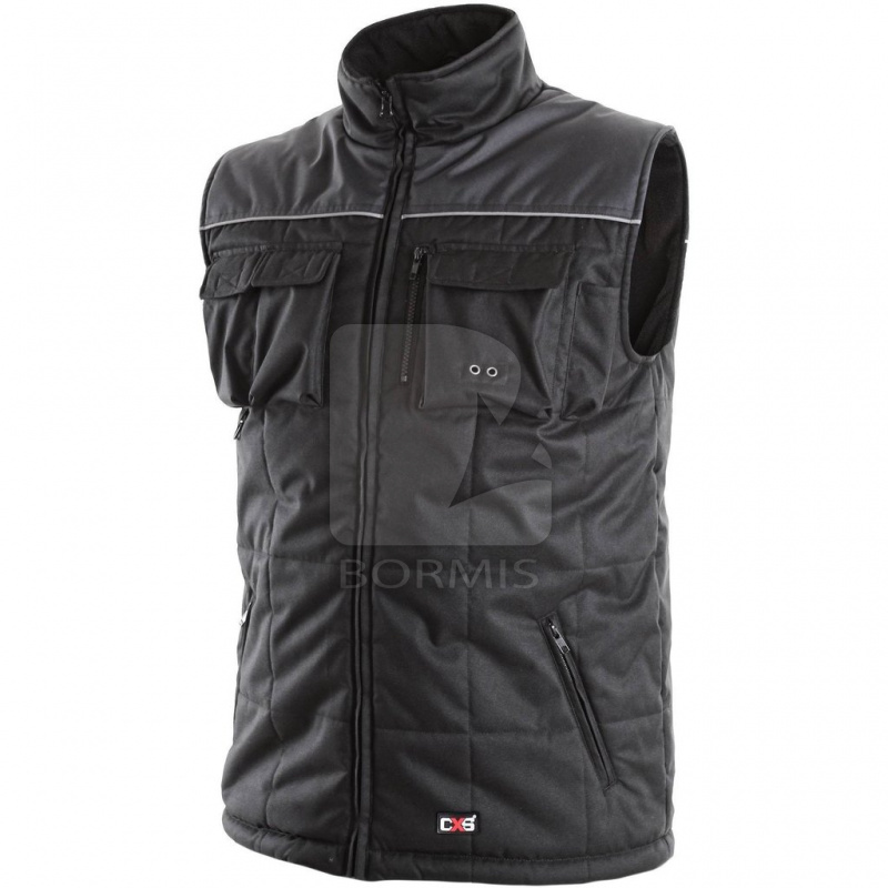 Zateplená vesta s fleecovým golierom, reflexné výpustky, sťahovanie v dolnom okraji, vnútorné vrecko, odolnosť materiálu voči prieniku vody 2000mm.