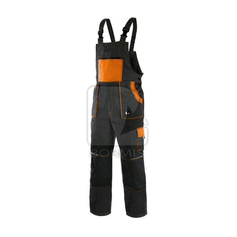 Pánske montérkové nohavice s náprsenkou, zdvojenými kolenami, prednými vreckami, náprsné vrecko na zips, bočnými vreckami na meter a na mobil. Zadné vrecko so záklopkou, traky s gumou vzadu, reflexné doplnky.