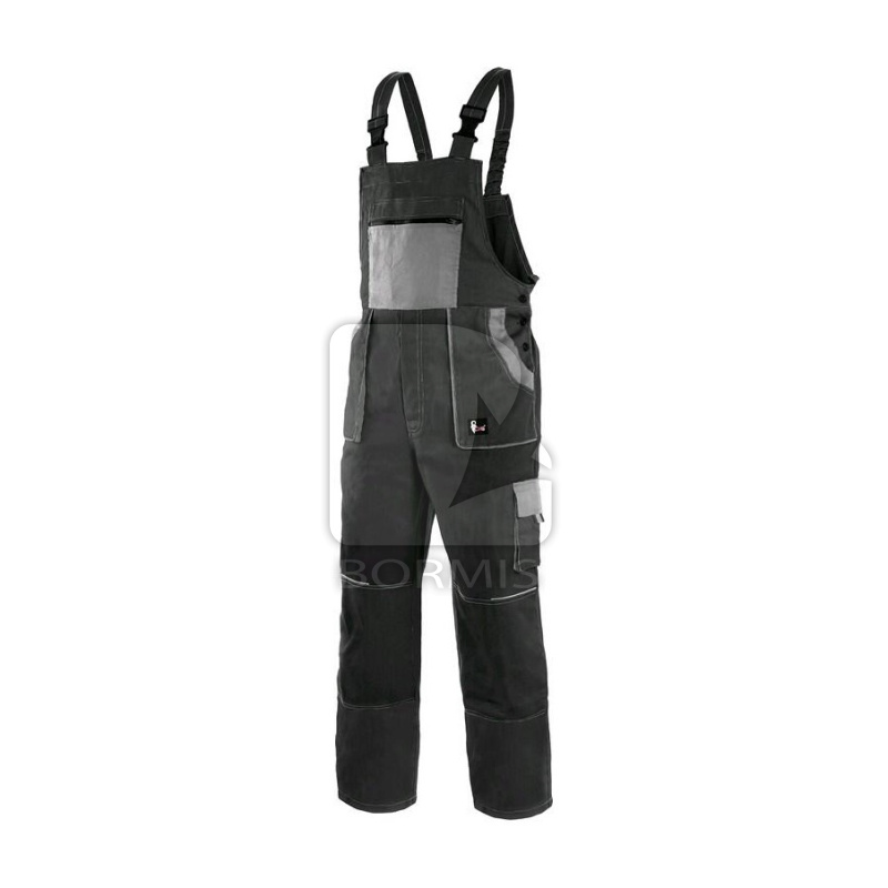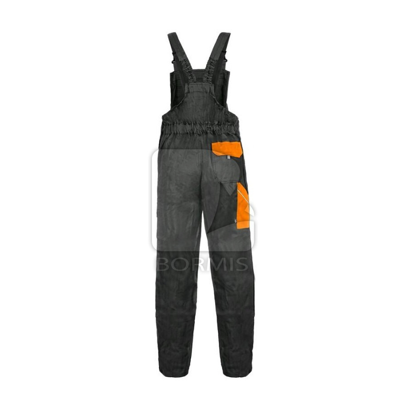 Pánske montérkové nohavice s náprsenkou, zdvojenými kolenami, prednými vreckami, náprsné vrecko na zips, s bočnými vreckami na meter a na mobil. Zadné vrecko so záklopkou, traky s gumou vzadu, reflexné doplnky.