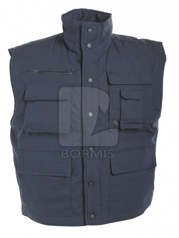Zateplená vesta so stojačikom, predĺžený zadný diel, predný zips je prekrytý légou s uchytením na plastové cvoky.