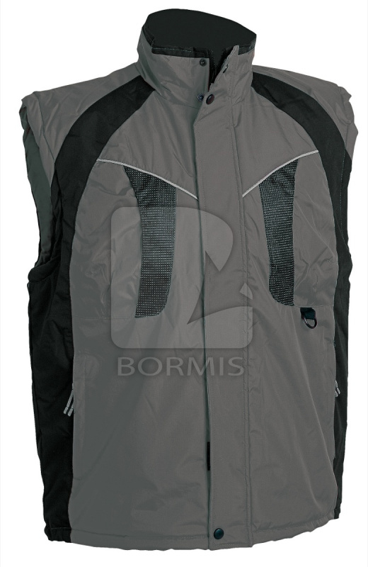 Zateplená nepremokavá vesta, odolná vetru. Podlepené švíky, sťahovacia šnúrka v spodnom leme, reflexné doplnky, vstup pre strojové vyšívanie.
