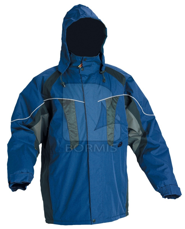Nepremokavá zateplená bunda s kapucňou v golieri. Spodný lem so sťahovaním na šnúrku, vrchný materiál s mechanicky odolnou úpravou, reflexné doplnky.