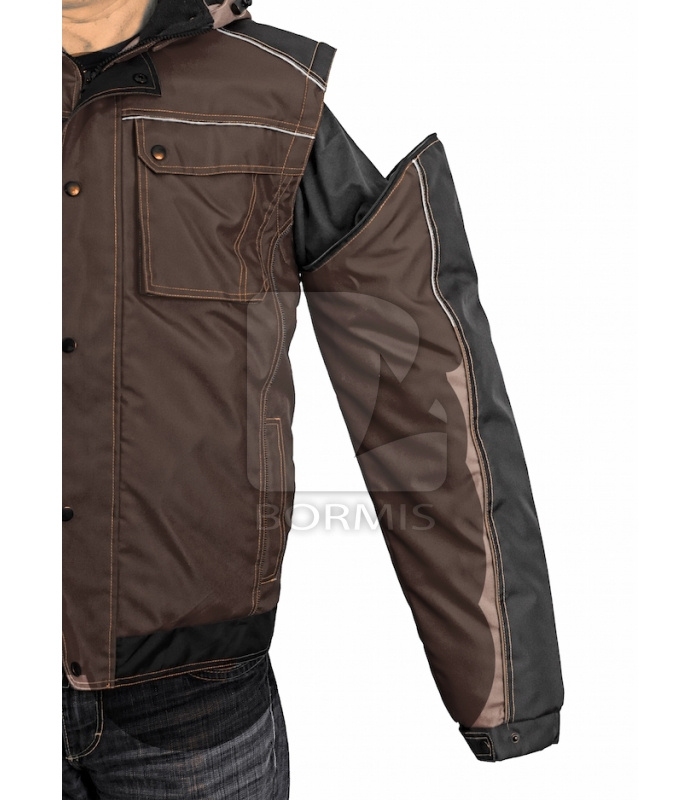 Zateplená bunda s odopínacou kapucňou, odopínacie rukávy. Rukávy a dolný okraj zakončený regulovateľnou manžetou. Lepené švy, vnútorné vrecko, reflexné výpustky.