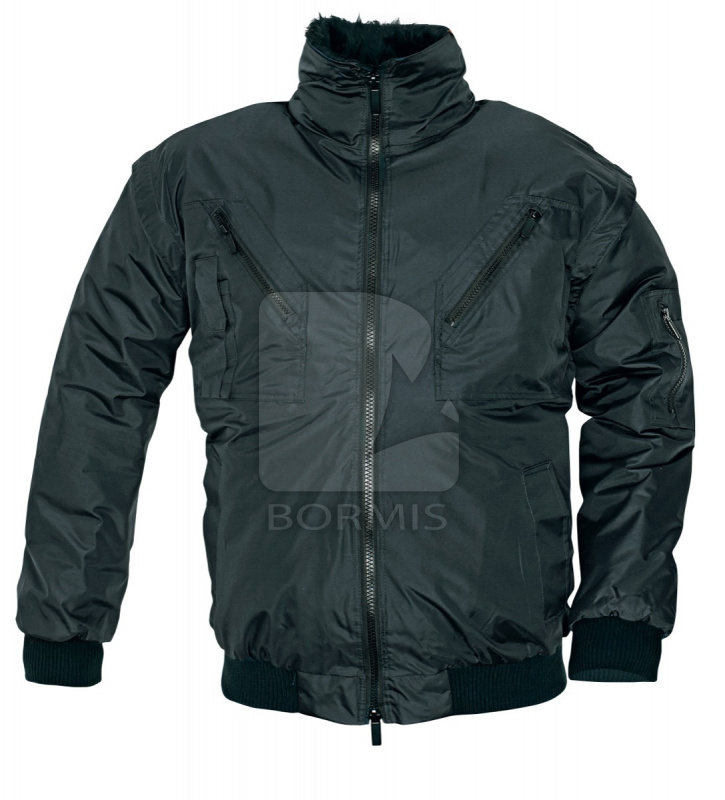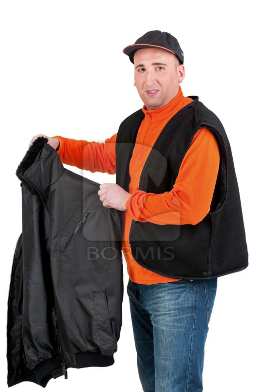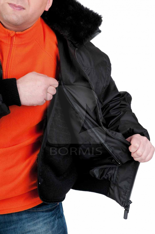 Zateplená nepremokavá bunda vzor „pilot“ s kapucňou v golieri a s odopínateľnou podšívkou a rukávmi. Odopínateľný golier z umelej kožušiny na suchý zips. Spodný lem a manžety rukávov z úpletu.