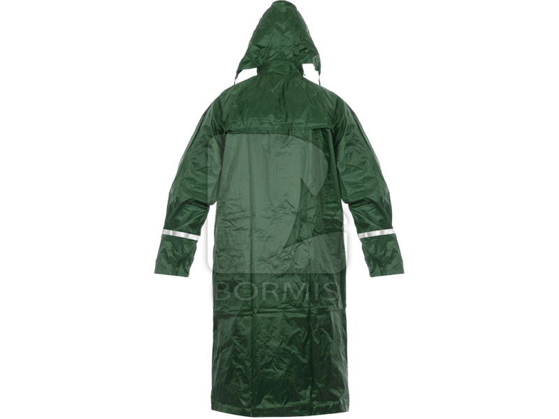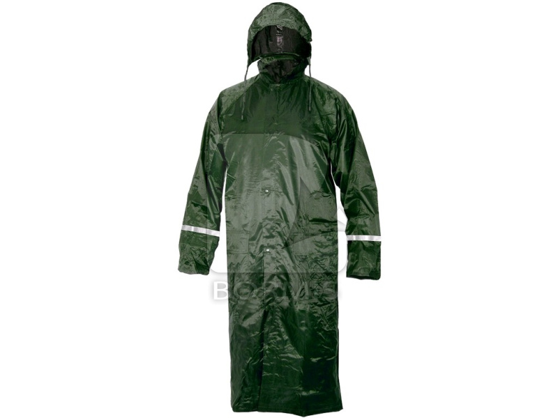 Nepremokavý plášť do dažďa s kapucňou v golieri a reflexnými doplnkami, nižšia hmotnosť. Zapínanie na zips aj cvoky, vnútorné manžety v rukávoch do gumy, vetranie na chrbte a v podpazuší, lepené švy. Praktické balenie na zips.