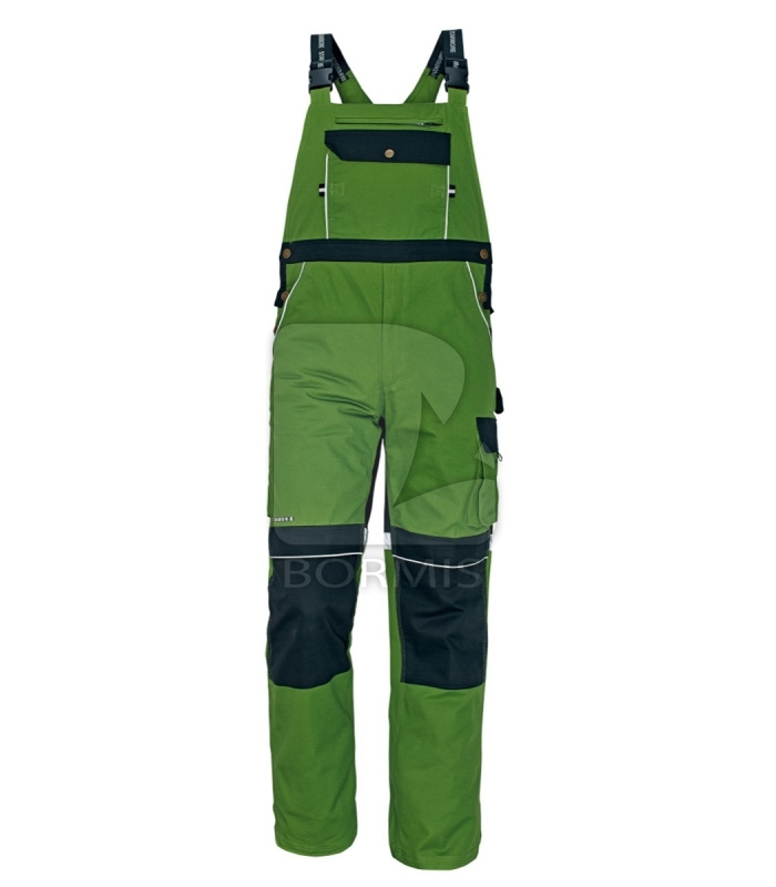 Nohavice s náprsenkou a reflexnými doplnkami, pohodlného strihu a s vysokou odolnosťou. Zosilnené zdvojené kolená pre vloženie nákolenníkov, kovové zipsy a cvoky, pútko na kladivo, 4 pútka na drobné náradie.