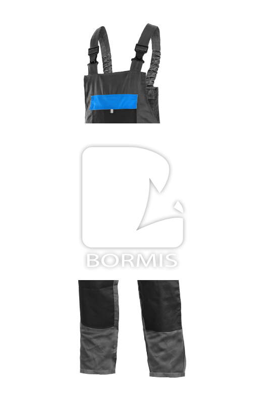 Pánske letné nohavice na traky, zosilnené kolená, predné klinové vrecká, vrecko na meter, bočné vrecko s chlopňou, zadné jednoduché vrecko, pás s pútkami na opasok, vrecko na náprsenke.