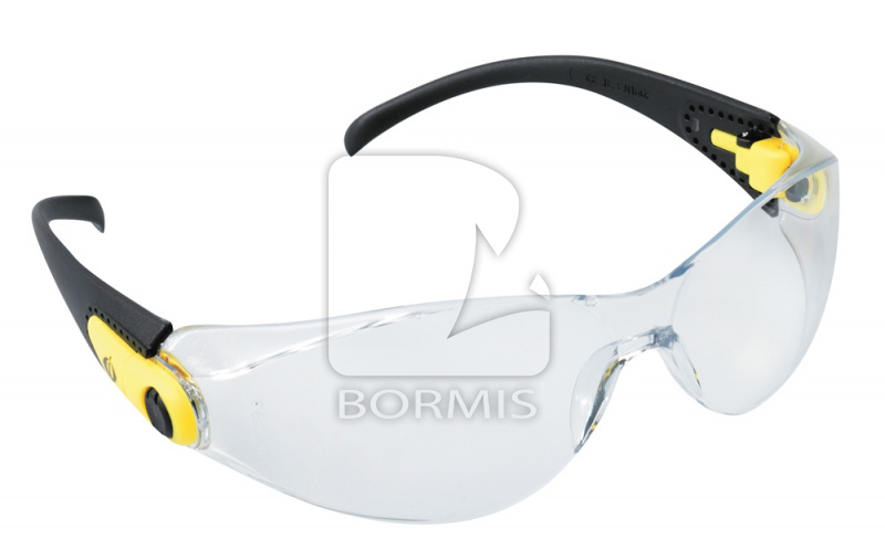 Okuliare s polykarbonátovým zorníkom, nastaviteľným uhlom stranníc, športovým vzhľadom, zorník s úpravou proti poškriabaniu a oroseniu, trieda F podľa normy EN 166, ochrana proti nárazu s malou energiou, optická trieda 1, sivý zorník s ochranným protislnečným filtrom podľa normy EN 172.