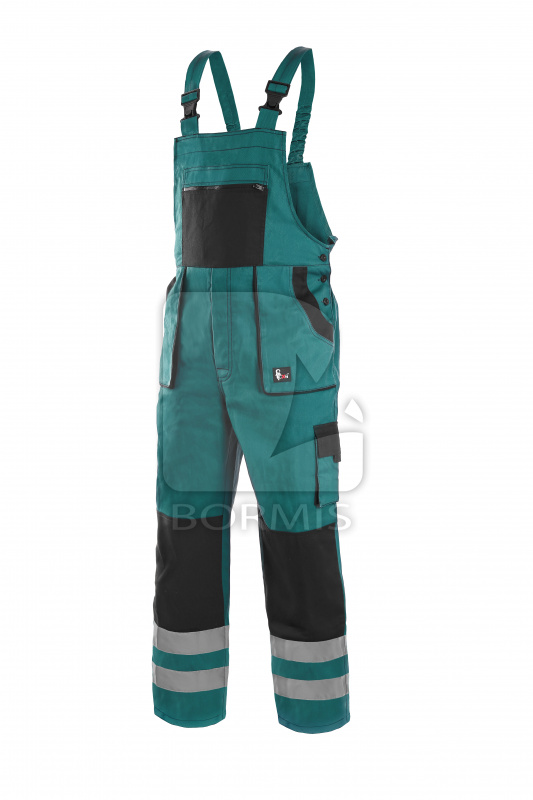 Pánske montérkové nohavice na traky, náprsné vrecko na zips, pás s pútkami na opasok, vzadu do gumy, predné vrecká, bočné vrecko na zvinovací / skladací meter, bočné vrecko na mobil / peňaženku, zdvojené kolená, zadné vrecko s klopou, traky s gumou vzadu, reflexné pruhy.