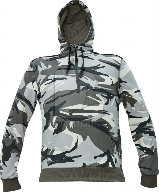 Pánska mikina s kapucňou a klokaním vreckom, zosilnené časti v oblasti ramien, elastické náplety na rukávoch a spodnom obvode, potlačená nepočesaná výplň s potlačou Crambe.