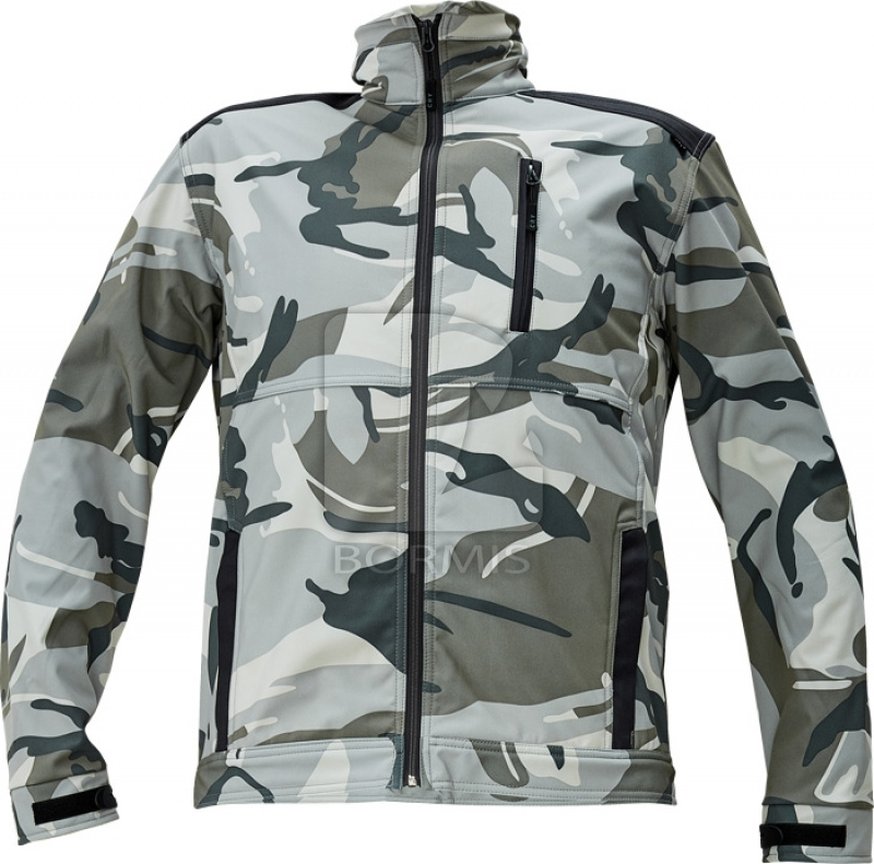 Pánska softshellová bunda so stojačikom, zosilnené ramená OXFORD 600D, 2 bočné vrecká na zips, 1 náprsné vrecko, nastaviteľná šírka manžety rukávov vďaka suchému zipsu, vysoké parametre 8000mm/3000 mvp.