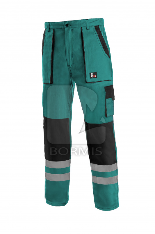 Pánske montérkové nohavice, pás s pútkami na opasok, vzadu do gumy, predné vrecká, bočné vrecko na zvinovací / skladací meter, bočné vrecko na mobil / peňaženku, zdvojené kolená, zadné vrecko s klopou, reflexné pruhy.