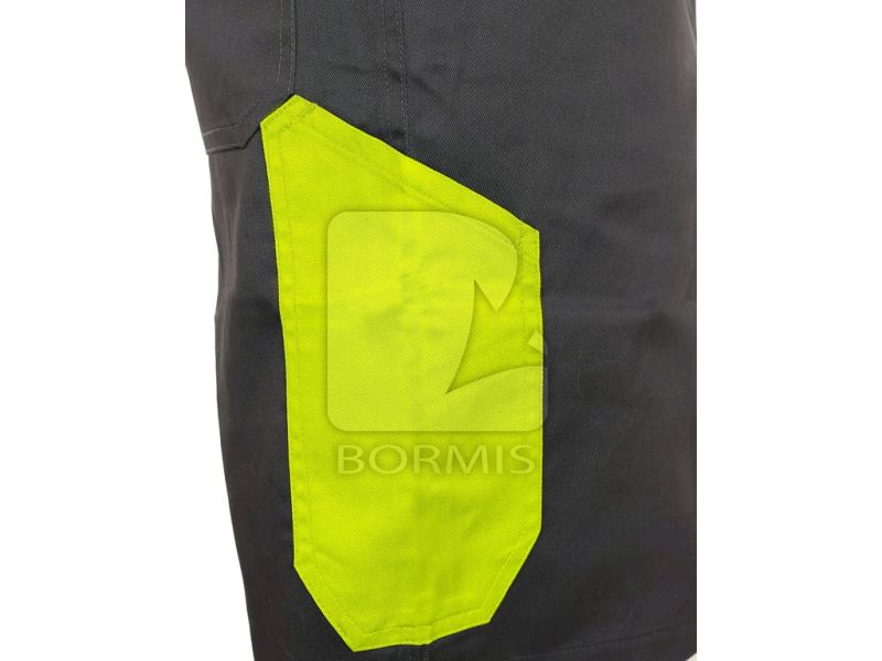 Pánske montérkové kraťasy, pas s pútkami na opasok, predné klinové vrecká, bočné vrecko so záklopkou, vrecko na skladací/ zvinovací meter, zadné jednoduché vrecko na pravej strane.