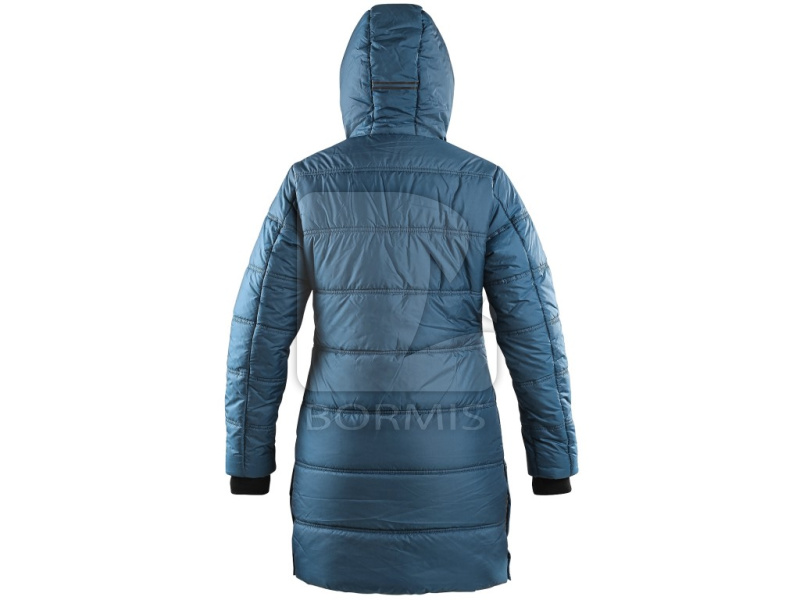 Dámsky zateplený kabát s kapucňou a bočným rozparkom na cvoky. Bočné vrecká na zips, rukávy ukončené pružnou manžetou, čierne reflexné doplnky na kapucni, rozparku a pozdĺž hlavného zipsu, vnútorné vrecko na zips.