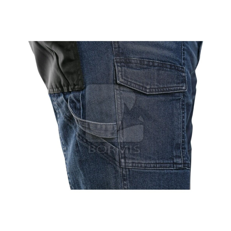 Pánske rifľové krátke nohavice. Pás s pútkami na opasok, dve zadné vrecká s materiálu CORDURA, bočné multifunkčné vrecká, plastové pútko.