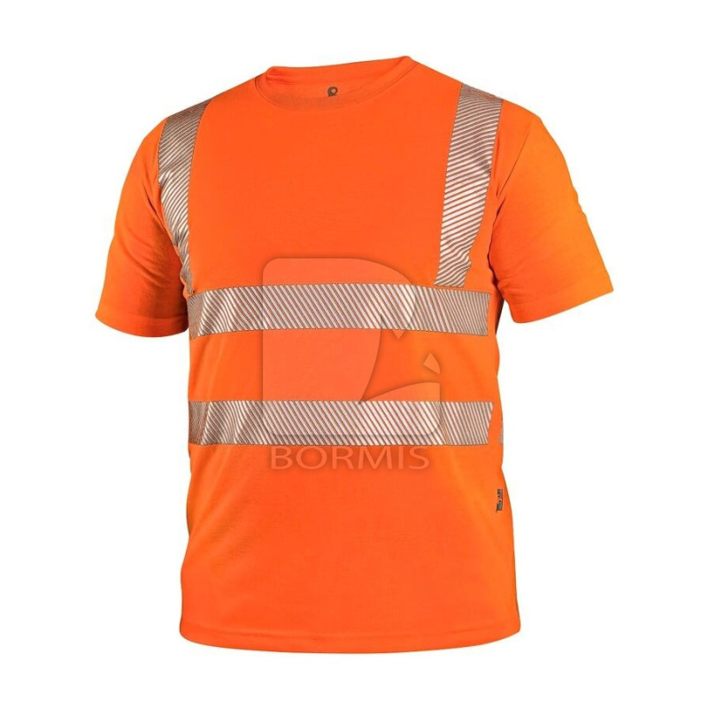 Pánske výstražné tričko CXS BANGOR. Okrúhly priekrčník, spevňujúca krčná páska, bočné švy, sieťovina v podpazuší, segmentované reflexné pruhy široké 5 cm.