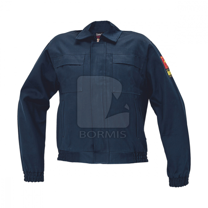 Pánska pracovná bunda odolná teplu, plameňu a statickej elektrike. Zapínanie kryté záklopkou na suchý zips, 2 náprsné vrecká kryté záklopkou prišitou na bokoch, 2 kryté vnútorné vrecká, rukávy s pružnou manžetou, bunda ukončená širokým na bokoch pružným lemom.