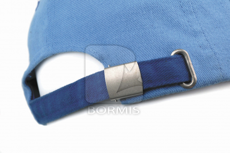 Čiapka baseballového typu s reguláciou veľkosti pomocou kovovej spony.