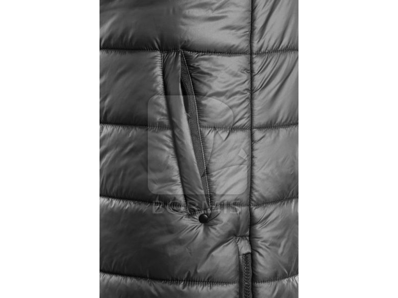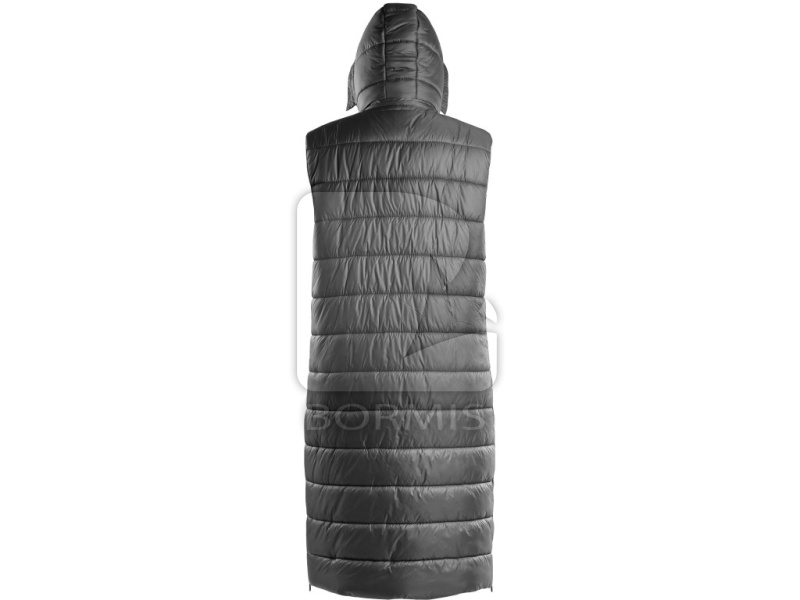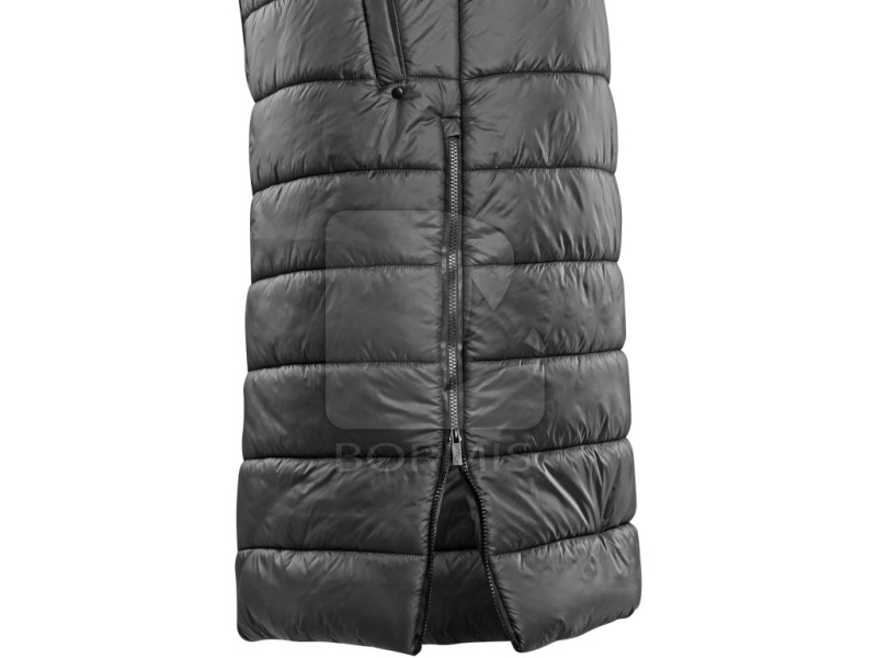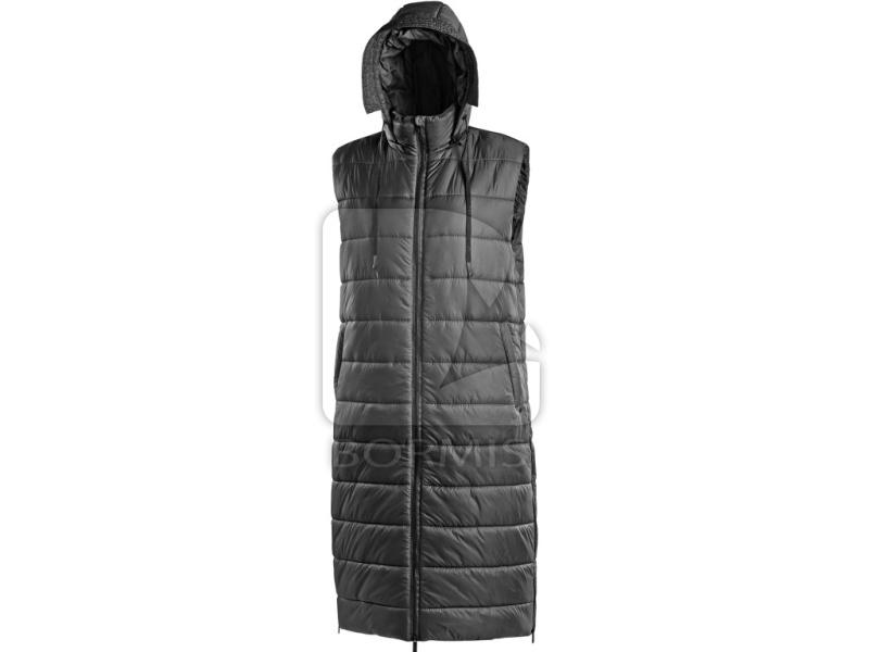 Dámska dlhá zateplená vesta s odnímateľnou kapucňou. Vesta je vybavená obojstranným zipsom, bočnými rozparkami na zips, bočnými vreckami na zips a vnútorným vreckom na zips. Na kapucni, pozdĺž hlavného zipsu a rázporku sa nachádzajú decentné čierne reflexné doplnky na zvýšenie viditeľnosti.