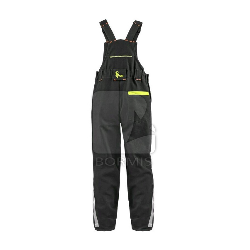 Detské nohavice s náprsenkou, náprsné vrecko na zips s menšími vreckami, pas s pútkami na opasok, bočné zapínanie na gombíky, v zadnej časti guma s gombíkom pre prispôsobenie veľkosti, predné klinové vrecká, vrecká na ceruzky a drobné predmety na ľavom stehne, zipsové vrecko na pravom stehne, zadné jednoduché vrecko, traky vzadu do gumy, reflexné doplnky.