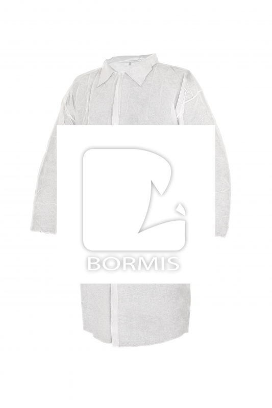 Jednorázový plášť. Netkaná textília, zapínanie na cvoky, rukávy do gumičky.