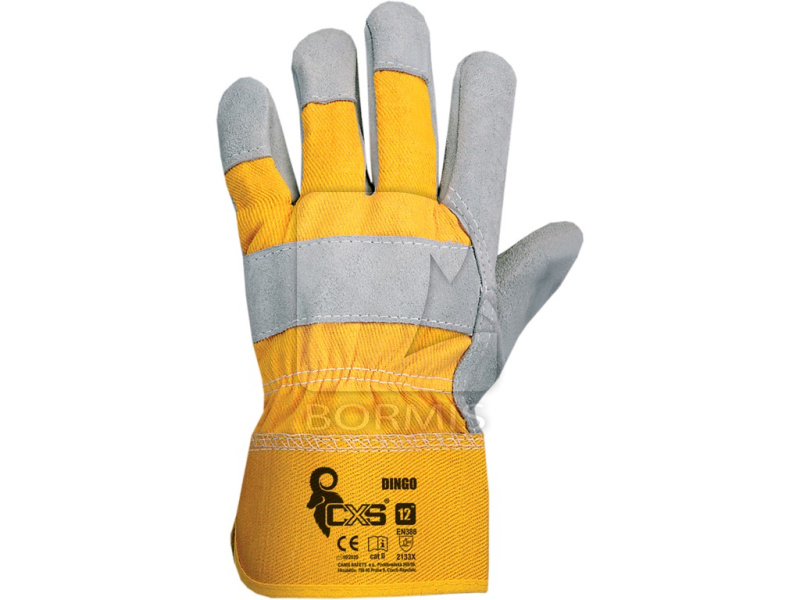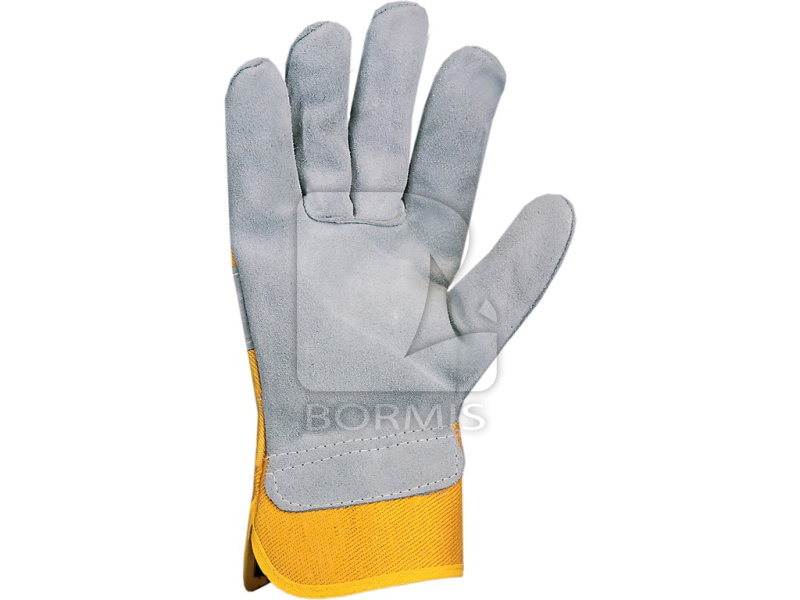 Kombinované kvalitné rukavice vyrobené s jedného kusu silnej kože. Doporučené použitie: určené pre suché prostredie. Odvetvie: stavebníctvo. Dlaň z hovädzej štiepenky, chrbát z hrubej bavlnenej tkaniny s tuhou manžetou.