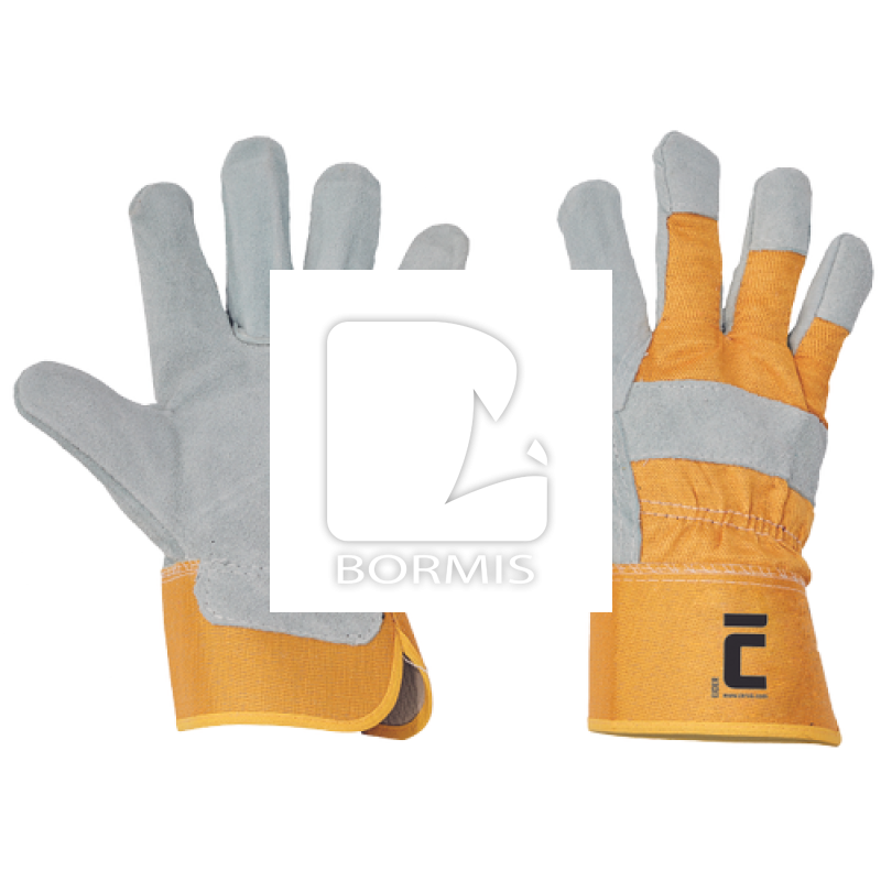 Rukavice z hovädzej štiepenky v dlani s podšívkou, bavlnená tkanina na chrbte, s vystuženou manžetou, celokoženými palcami a ukazovákmi a prekrytými špičkami prstov. Farba - žltá. Veľkosť: 10