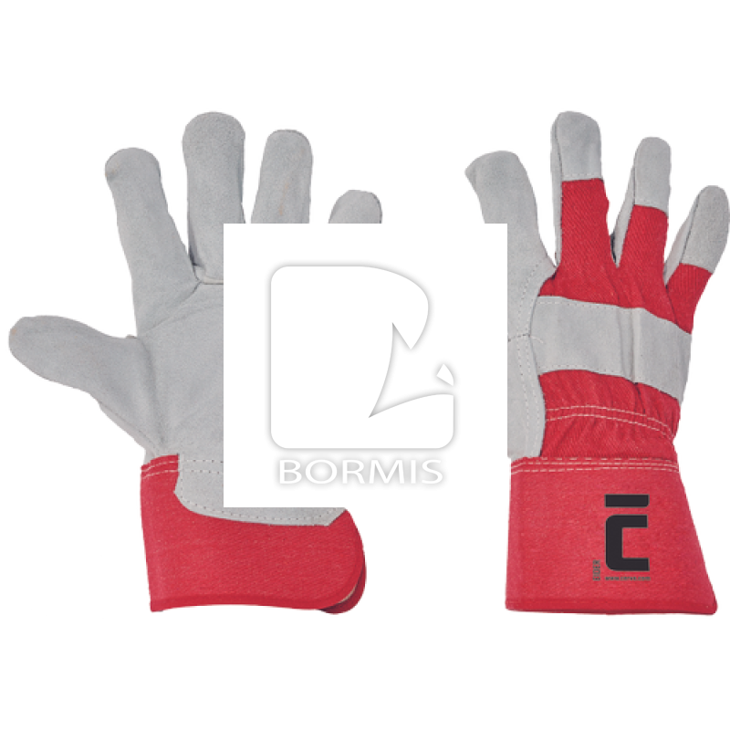 Rukavice z hovädzej štiepenky v dlani s podšívkou, bavlnená tkanina na chrbte, s vystuženou manžetou, celokoženými palcami a ukazovákmi a prekrytými špičkami prstov. Farba - červená. Veľkosť: 11