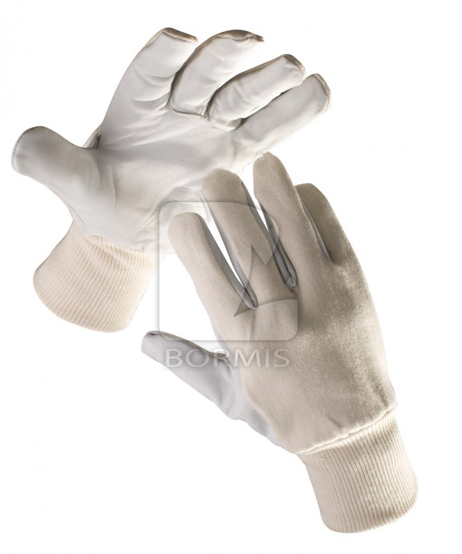 Rukavice šité z jemnej lícovej kozinky v dlani, bielej bavlnenej tkaniny na chrbte a s nápletom.