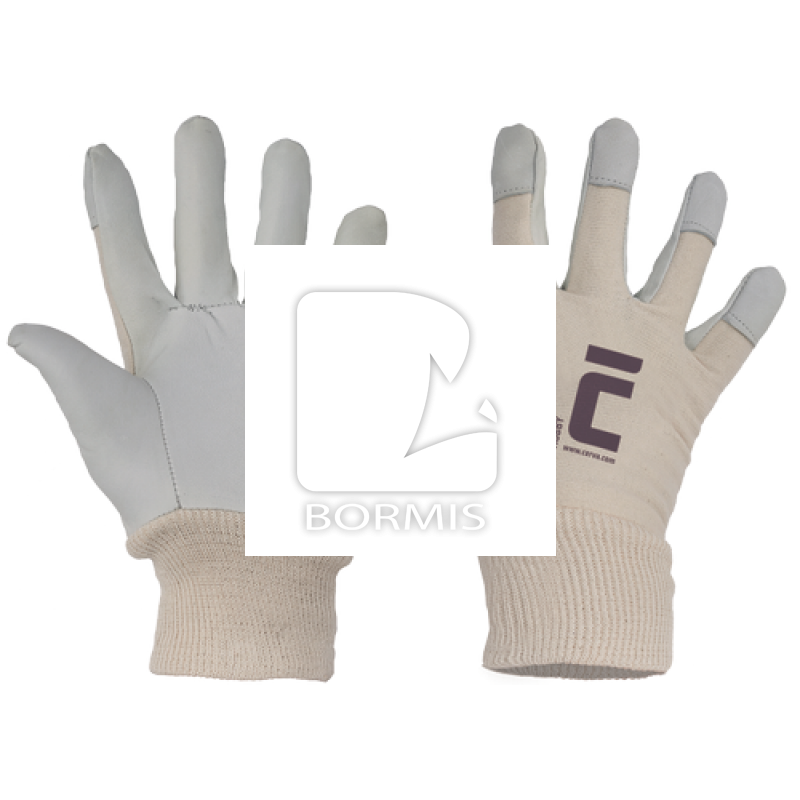 Rukavice z lícovej ovčiny v dlani, bavlnenej tkaniny na chrbte, s prekrytými špičkami prstov a nápletom na zápästí.
