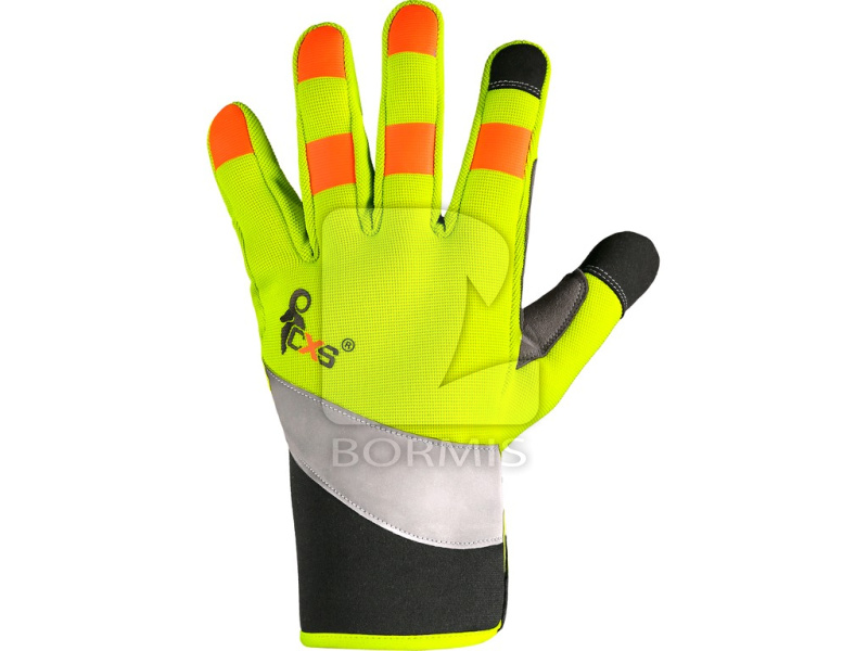 Kombinované rukavice s reflexným pásikom a silikónovými aplikáciami na prstoch pre lepší úchop a manipuláciu. Dlaň je vyrobená zo syntetickej kože (mikrovlákna), vďaka ktorej sú rukavice pohodlné a odolné voči zrazeniu, naťahovaniu a tvrdnutiu. Chrbát z priedušného Spandexu s PU reflexným pásikom. Neoprénová manžeta so suchým zipsom sa ľahko prispôsobí zápästiu.