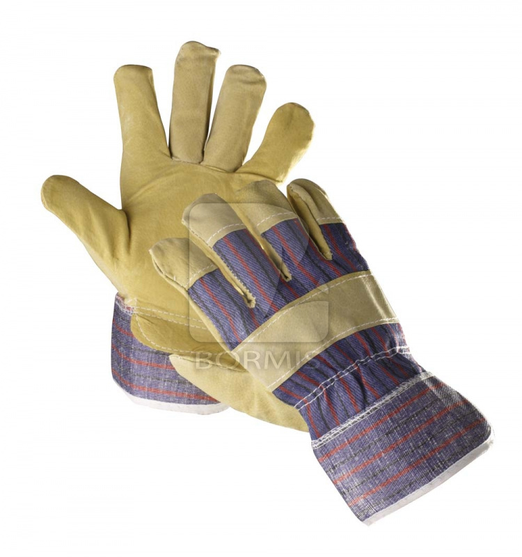 Rukavice z hovädzej štiepenky v dlani s podšívkou, chrbát a manžeta z bavlnenej tkaniny.