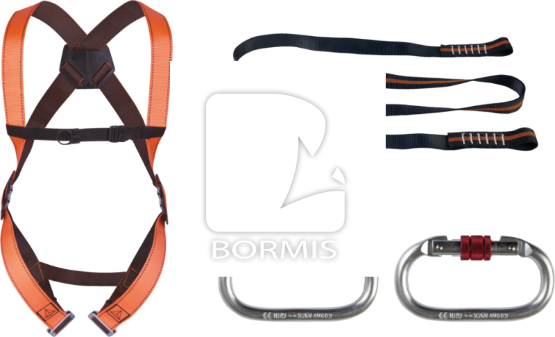 Súprava na zachytenie pádu na okamžité používanie – obsahuje: Bezpečnostný postroj s 1 bodom uchytenia ( chrbtový ). 2 nastaviteľné spony s odnímateľným popruhom, 2 karabíny AM002, 1x LO030150, 1x HAR11