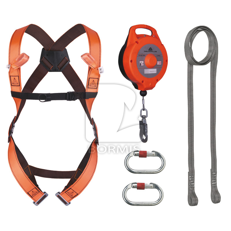 VERTIKÁLNE A HORIZONTÁLNE POUŽITIE 10 M - Súprava na zachytenie pádu na okamžité používanie: Bezpečnostný postroj s 2 bodmi uchytenia (chrbtový - prsný). 2 nastavovacie spony (ref. HAR12) Samonavíjacie zariadene na zachytenie pádu s oceľovým lanom. Dĺžka 10 m. Plastový kryt. 1 automatický spojovací komponent s XX a indikátorom pádu AM016 (ref. AN123T). Pridržiavací a kotviaci popruh, dĺžka 2 m (ref. LO030).