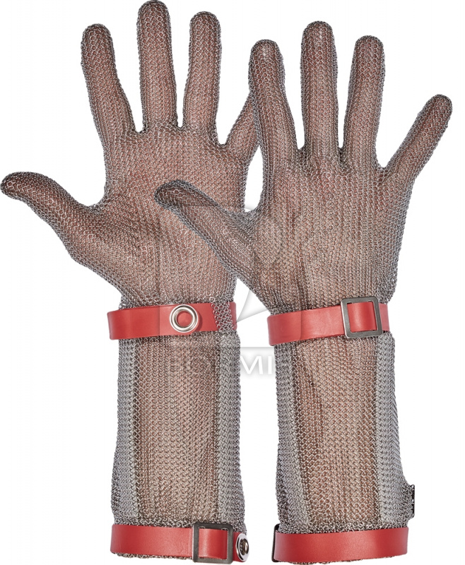 Obojručné rukavice z oceľových krúžkov, s textilným sťahovacím remienkom, chráničom predlaktia, maximálnou ochranou proti porezaniu a 15 cm širokou manžetou.