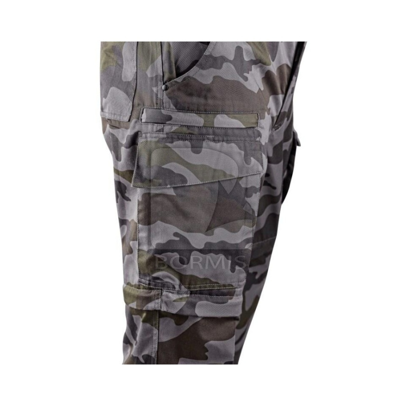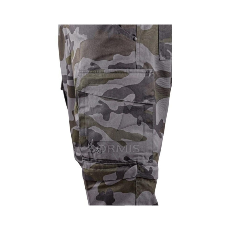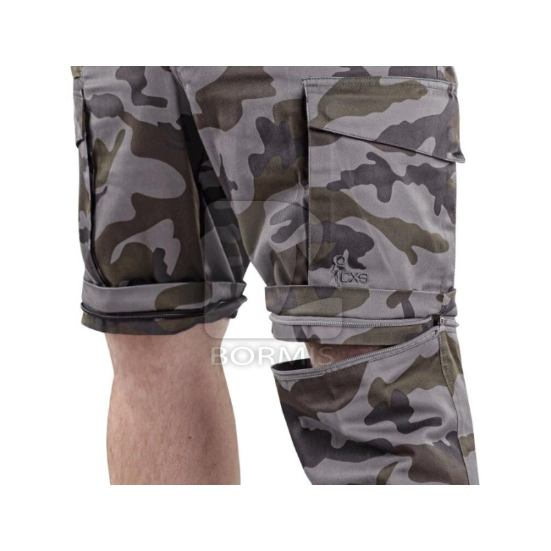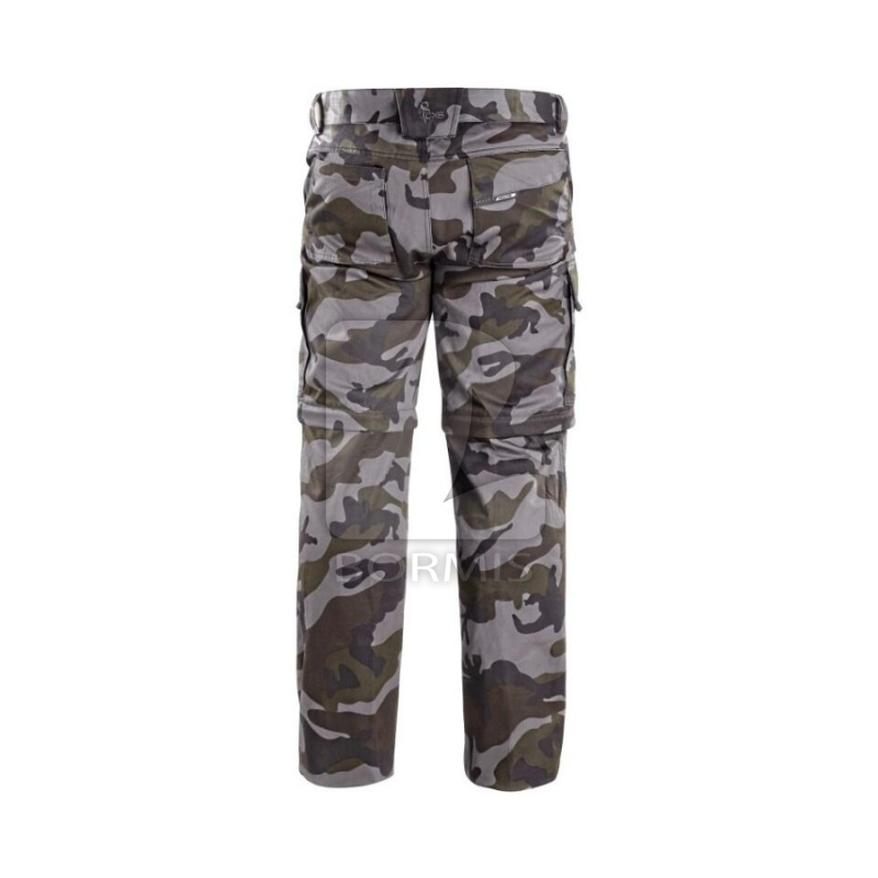 Pánske maskáčové nohavice s odnímateľnými nohavicami a hydrofóbnou úpravou. Pružný pás s pútkami na opasok, predné vrecká, zadné vrecká, pravé zadné vrecko s príklopkou na suchý zips, bočné vrecká s príklopkou, pravé bočné vrecko na zips. Použitie na voľný čas aj do práce. Zips odnímateľných nohavíc je farebne odlíšený, aby bolo možné ľahšie rozlíšiť pravé a ľavé nohavice