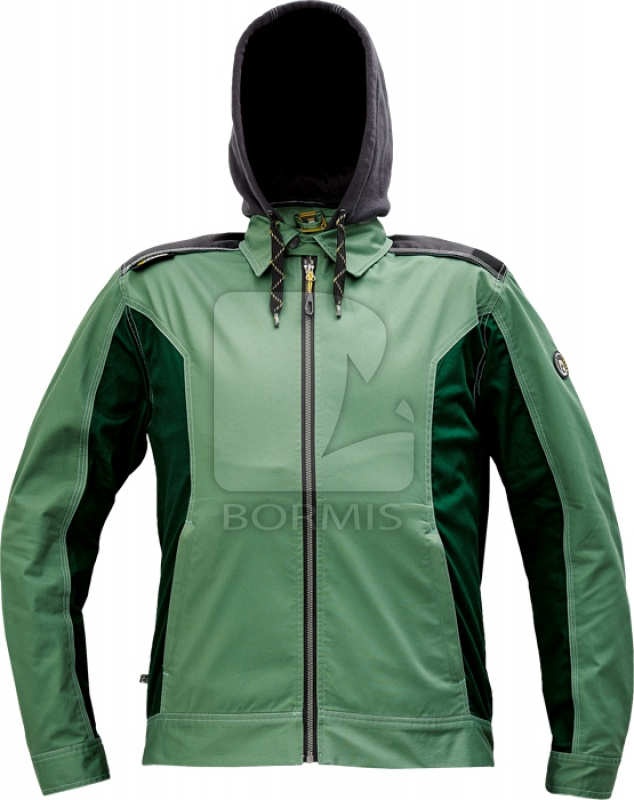Pánska pracovná bunda, elastická inovatívna tkanina TRIFIBETEX - ergonomický strih, odnímateľná kapucňa, oxfordská ramenná výstuž, 2 bočné vrecká, 1 vnútorné vrecko na telefón, reflexný odtieň vo farebných častiach.