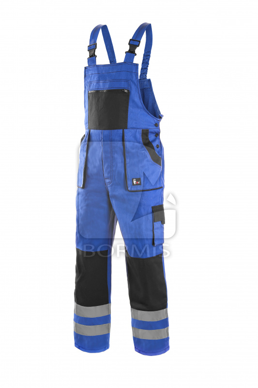 Pánske montérkové nohavice na traky, náprsné vrecko na zips, pás s pútkami na opasok, vzadu do gumy, predné vrecká, bočné vrecko na zvinovací / skladací meter, bočné vrecko na mobil / peňaženku, zdvojené kolená, zadné vrecko s klopou, traky s gumou vzadu, reflexné pruhy.