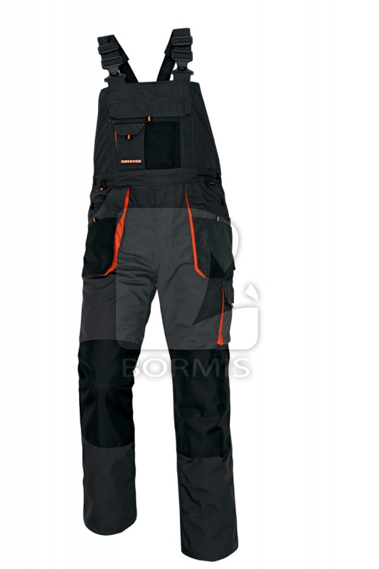 Montérkové nohavice s náprsenkou pohodlného strihu a s vysokou odolnosťou, namáhané miesta vystužené materiálom polyester 600D, zosilnené zdvojené kolená pre vloženie nákolenníkov, pútko na kladivo, vyrobené do náročných podmienok.