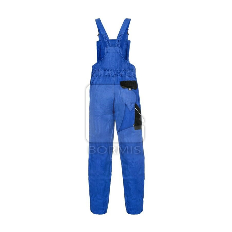 Pánske montérkové nohavice s náprsenkou, zdvojenými kolenami, prednými vreckami, náprsné vrecko na zips, bočnými vreckami na meter a na mobil. Zadné vrecko so záklopkou, traky s gumou vzadu, reflexné doplnky.