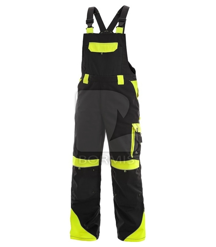 Pánske nohavice na traky, zosilnené kolená s možnosťou vloženia kolenných výstuh, pevný pás s pútkami na opasok, predné klinové vrecká, zadné vrecká s klopami, bočné multifunkčné vrecká, náprsenka s vreckom, reflexné doplnky.