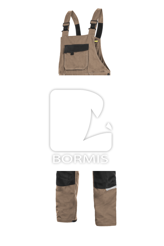 Pánske montérkové nohavice na traky, strečová tkanina umožňujúca voľný pohyb, náprsné vrecko so záklopkou, pás s pútkami na opasok, predné vrecká s vreckom na zips, multifunkčné vrecká na oboch stranách, kolená spevnené 600D polyesterom s možnosťou vloženia kolenných výstuh, dve zadné vrecká, jedno so záklopkou, zadný spodný lem nohavice vystužený 600D polyesterom, traky s gumou vzadu, reflexné doplnky.