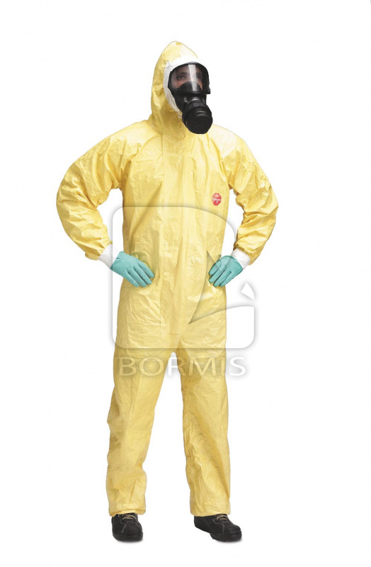 Antistatická vodeodolná kombinéza Tychem C (DuPont) s kapucňou a prelepenými švami, odolná koncentrovaným anorganickým chemikáliám a ultra jemným časticiam, patrí do kategórie CE III, typ 3, 4, 5 a 6.