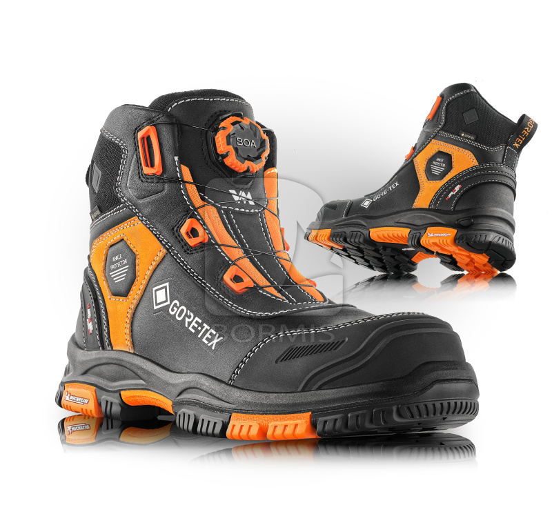Členková bezpečnostná obuv, celokožená s podošvou MICHELIN, membránou GORE-TEX® a systémom šnurovania BOA.