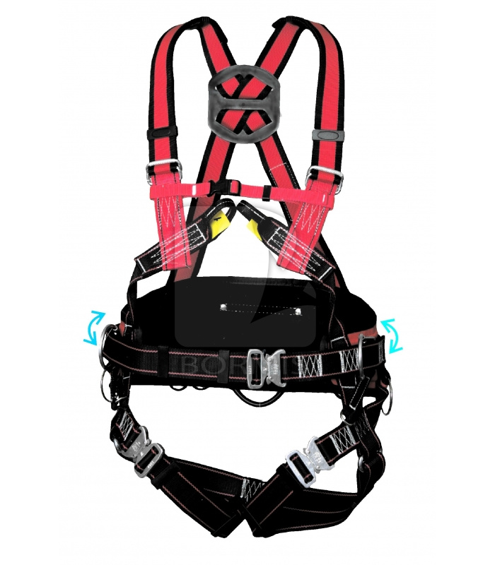 Bezpečnostný postroj. Zadná pripojovacia spona – kombinácia so systémom proti zachyteniu pádu. Predné pripojovacie slučky. Zapínacie a nastavovacie spony-pre komfortné nasadenie a používanie prístroja. Pohyblivý polohovací pás s automatickou sponou.