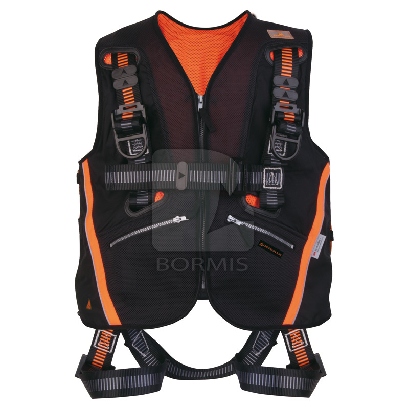 Postroj s odpružením integrovaný do pracovnej vesty: Postroj (ref. HAR23). Vesta: Polyester, Cordura a úplet 3D. Zapínanie na zips. 2 vrecká so zipsom. Bočné reflexné a retroreflexné pásky. Veľkosť nastaviteľná pomocou bočných šnúrok.
