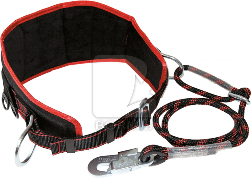 Pracovný polohovací pás PB 20 – bedrová výstuha s polohovacími okami a sponou k nastaveniu veľkosti – pútka k pripojeniu brašne na náradie – s univerzálnym bezpečnostným lanom s nastavením 1,5 m a s oceľovou karabínou s poistkou – EN 362, EN 354, EN 358 – CE 0082