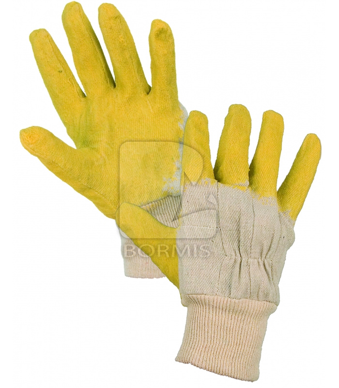 Rukavice s dlaňami a prstami máčanými v žltom latexe zdrsnenom pre lepší úchop s úpletovou manžetou.